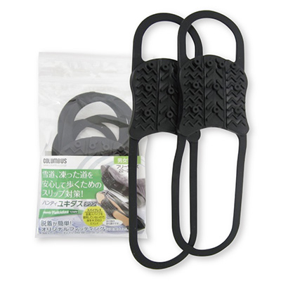 街中での雪道や、凍った道を安心して歩行するための靴用滑り止めです。耐久性のあるゴムバンドで靴に取り付け、合成樹脂製の靴底が雪や氷をしっかりと捉えます。コンパクトなので持ち運びにも便利で、旅行や出先でも活躍します。また、金属スパイクを使用していないため床をキズつけにくく、歩行時の音も静かです。